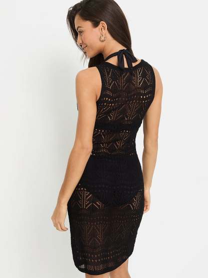 Semi-sheer and plenty sexy, this crochet mini dress is made of a soft openwork knit with comfortable wide straps.