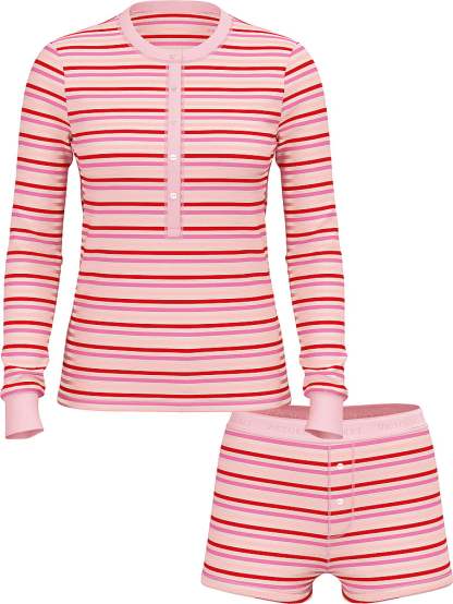 This cozy set fits close to the body and comes in supersoft cotton with a hint of stretch. Features a henley top plus cute shorts in a variety of colors and prints.